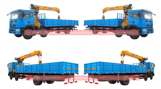 Autocarri con gru con braccio telescopico Dongfeng modello 12T in vendita, modello LHD e RHD opzionale, motore diesel CUMMINS di tipo pesante 260 CV, cambio manuale a 8 marce per la vendita calda. Dotato di gru a braccio telescopico da 12 Ton. Il modello di box di carico richiesto dal cliente con lunghezza può essere lungo fino a 8000 mm, con telecomando a scelta del cliente