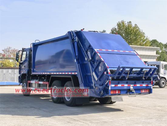 Il compattatore per rifiuti Howo 6x4 da 20 mc è stato modificato sulla base del telaio Sinotruk Howo NX 6x4, con un passo di 4600+1350 mm. È equipaggiato con un motore Sinotruk WD615.47, HW19710, e un cambio a 10 marce. La parte superiore del cassone è un cassone per rifiuti compressi in acciaio al carbonio a forma di arco da 20 metri cubi con trattamento anticorrosione e antiruggine, un coperchio posteriore completamente sigillato e un meccanismo di ribaltamento del cassone sospeso. Il carico e lo scarico dei rifiuti sono controllati da un sistema di controllo elettronico CAN-BUS, in particolare tramite tre punti di controllo: la centralina elettronica in cabina, la leva di azionamento idraulico manuale sul lato conducente e la centralina elettronica sul portellone posteriore.