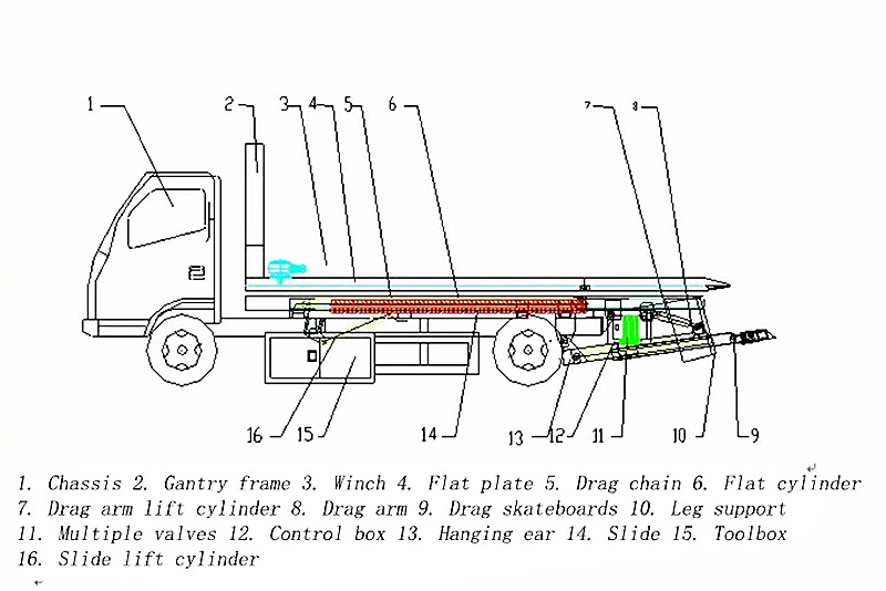 Il dispositivo di sollevamento idraulico consente di regolare l'angolazione del pallet, rendendo il traino più flessibile. Il pallet è un componente chiave che supporta il veicolo trainato, garantendone sicurezza e stabilità. Il verricello viene utilizzato per rimuovere rapidamente il veicolo in panne ed è controllato elettronicamente, migliorando l'efficienza e la sicurezza.