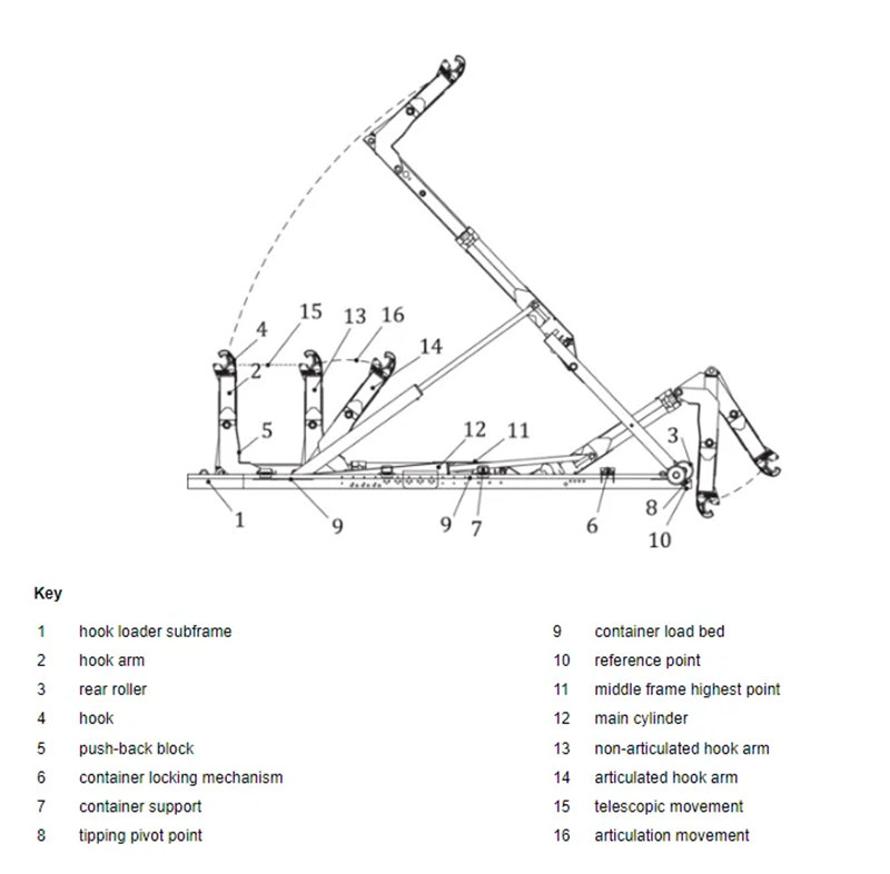 Il ciclo operativo funziona così: Durante il carico, il braccio del gancio aggancia il gancio anteriore del cassone dei rifiuti e il sistema idraulico tira delicatamente il cassone sul telaio, fissandolo. Durante lo scarico, il braccio del gancio spinge lentamente il cassone fuori dal telaio, separandolo dal telaio per facilitarne il riciclaggio.