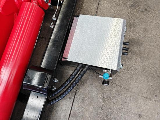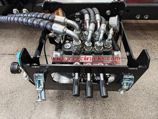 Questo olio ad alta pressione viene erogato tramite linee idrauliche ai cilindri idraulici, azionando l'estensione, la rotazione e i movimenti di sollevamento/abbassamento del braccio del gancio, controllando anche l'apertura e la chiusura del meccanismo di bloccaggio per agganciare, sollevare e fissare il contenitore dei rifiuti. L'intero processo è controllato con precisione dal sistema idraulico, garantendo un movimento fluido e continuo.