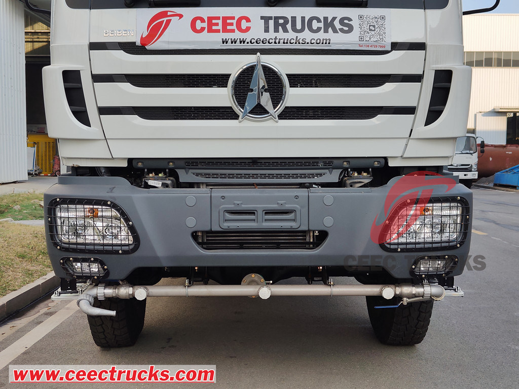 Autocisterna Beibenè un efficiente e pratico veicolo igienico-sanitario per la pulizia delle strade e l'irrorazione dell'acqua. Basato sulla tecnologia originale Mercedes Benz BEIBEN 1929 modello 4x4 telaio di tipo fuoristrada, montato con cisterna per l'acqua da 8000 litri, materiale acciaio al carbonio Q235, con cisterna e guscio entrambi di 4 mm di spessore, pompa dell'acqua TOP 1 del marchio cinese WEILONG, dotata di set completo di sistema di spruzzatura dell'acqua, incluso ugelli di spruzzatura dell'acqua anteriori, ugelli di spruzzatura dell'acqua posteriori, anche piattaforma posteriore con cannone ad acqua, piattaforma di sicurezza e recinzione per il controllo dell'aria superiore.