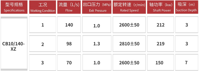 Questa pompa ha una portata nominale da 70 a 140 l/s, una pressione nominale di circa 1,0 MPa e una prevalenza massima di oltre 100 metri. È caratterizzata da un avvio rapido, un'elevata altezza di aspirazione e un'erogazione idrica stabile. La sua elevata capacità di aspirazione consente un rapido autoadescamento (fino a un'altezza di circa 7 m se utilizzata con un dispositivo di deviazione dell'acqua a vuoto).