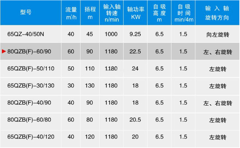 La pompa per acqua 80QZF-6090S è una pompa centrifuga autoadescante specificamente progettata per l'uso in autocisterne e altri veicoli specializzati. I suoi parametri principali includono: portata 60 m³/h, prevalenza 90 m, altezza di autoadescamento 6,5 m e tempo di autoadescamento 1,5 min. È realizzata in ghisa e presenta una struttura autoadescante con miscelazione esterna. Azionata dalla presa di forza del veicolo, è adatta al trasporto di acqua pulita.