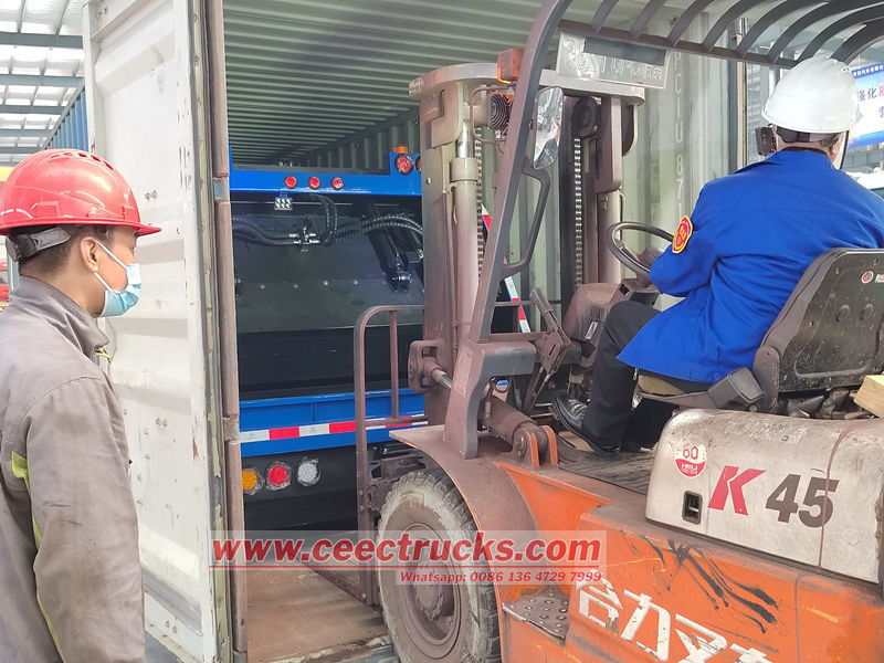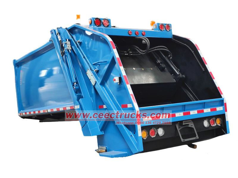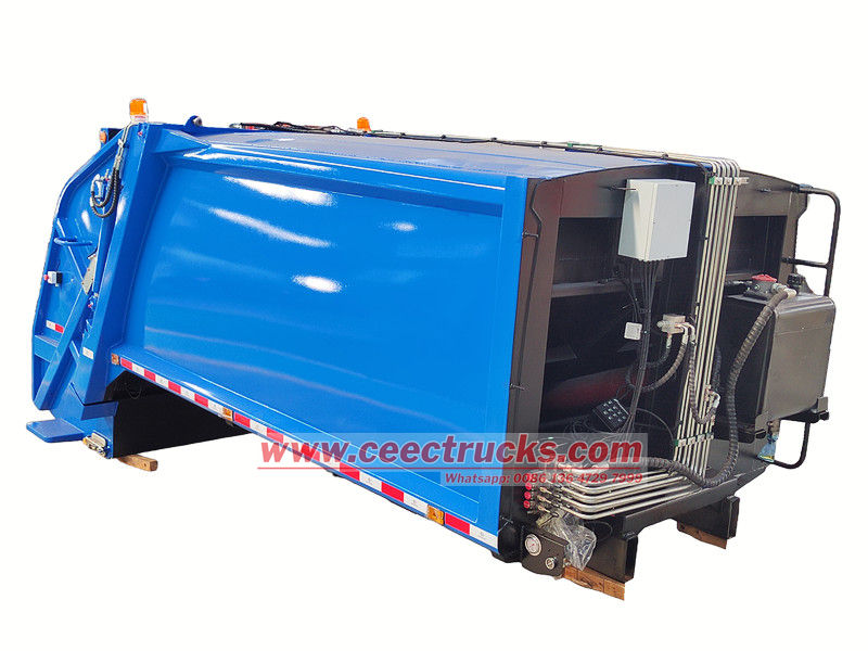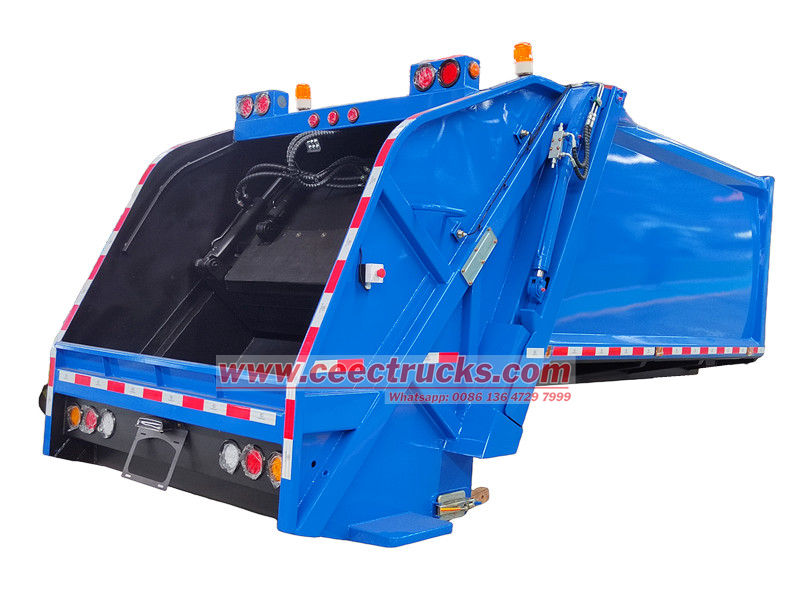 Il cassone per rifiuti a caricamento posteriore da 10 CBM è costituito da un vano sigillato, una pala di spinta, un caricatore, un sistema idraulico e un sistema di controllo elettronico. Il vano è costituito da travi rinforzate saldate a piastre d'acciaio, con guide di scorrimento interne per lo scorrimento e lo scarico della pala di spinta. Un sistema idraulico controlla il movimento di ciascun cilindro, mentre il sistema di controllo elettronico consente il funzionamento automatizzato, garantendo un funzionamento efficiente e sigillato durante l'intero processo di raccolta, compressione e trasporto dei rifiuti, prevenendo la contaminazione secondaria.