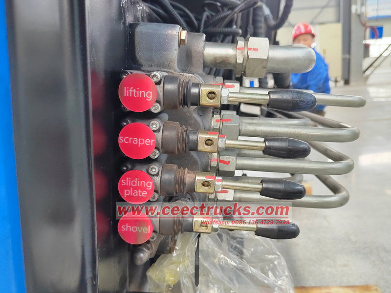 ● Funzione: Compressione secondaria: dopo che i rifiuti sono stati caricati nel cassone di carico, la lama di spinta si sposta in avanti per comprimere ulteriormente i rifiuti, aumentando la capacità di carico.