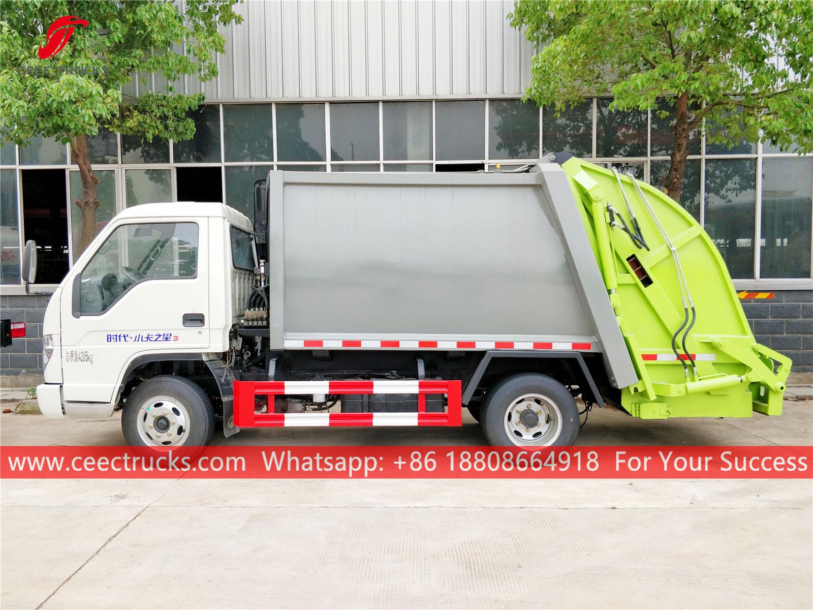 Camion compattatore per rifiuti FOTON da 4.000 litri, telaio FOTON 4*2, motore diesel QUANCHAI 88HP, cambio manuale a 5 marce per una guida facile, scatola di controllo PLC.