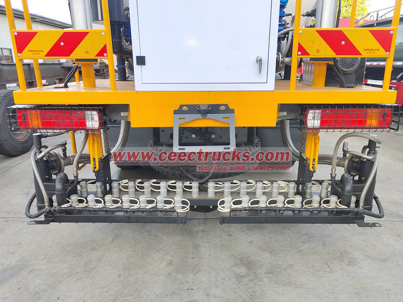 La parte posteriore del veicolo è dotata di una barra irroratrice retrattile (lunghezza regolabile da 2 a 6 metri) dotata di pompa centrifuga ad alta pressione e ugello a ventaglio. L'ampiezza e la portata dello spruzzo possono essere regolate in continuo (da 0,3 a 3 l/m²) tramite il computer di bordo per soddisfare le esigenze di diversi processi, come il rivestimento penetrante, il rivestimento adesiva e il rivestimento sigillante.