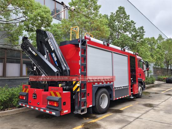 The Howo emergency lighting fire truck, built on the premium Howo C5H chassis, combines superior power with environmentally friendly emissions. With all-wheel drive, it can handle any challenging road conditions. Equipped with an independent power generation system and emergency lighting system, it provides multi-angle, all-round illumination for quickly illuminating rescue routes in the event of a fire. The control panel offers selectable languages and a variety of optional configurations to meet diverse needs. The Howo fire rescue truck is also equipped with a 6 ton folding boom crane at the rear for heavy lifting. A 3 ton, 35m electric tow rope is located in front of the cab.