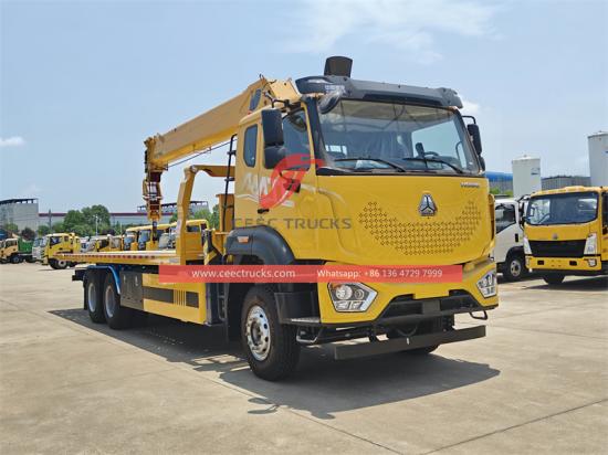 This Howo flatbed tow truck with 8T crane is a versatile and well-designed special truck. It is equipped with a diesel engine of Chinese brand Yuchai Engine, with a strong power of 260HP, which can meet various work needs. The new M9 luxury cab can accommodate three people and is equipped with air conditioning, providing a comfortable driving environment for drivers and operators. The crane is a telescopic boom with a maximum lifting capacity of 8000kg, 360° full rotation, and a maximum lifting height of 16.5m. The crane designed by CEEC factory weighs 1850kg and has an installation space of 1350mm, which is light and space-constrained. At the same time, the crane truck combines the flatbed tow system, with a load capacity of 12-15tons, providing more possibilities for engineering operations. The control panel can be selected in English or other languages, which is convenient for users with different needs. Howo cargo crane truck also provides a variety of optional configurations, such as folding arm boom, hydraulic dump box, customized box thickness and height according to needs, and optional remote control box.