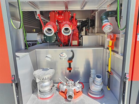Pompa antincendio ad alte prestazioni– Dispone di una pompa antincendio CB10/80 con una portata di 4.800 l/min a 10 bar, che garantisce uno scarico di acqua/schiuma potente e affidabile. Opzionalmente, è possibile utilizzare una pompa antincendio di marca Darley e HALE.