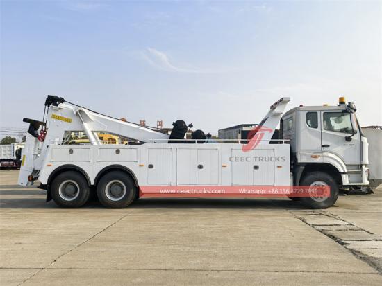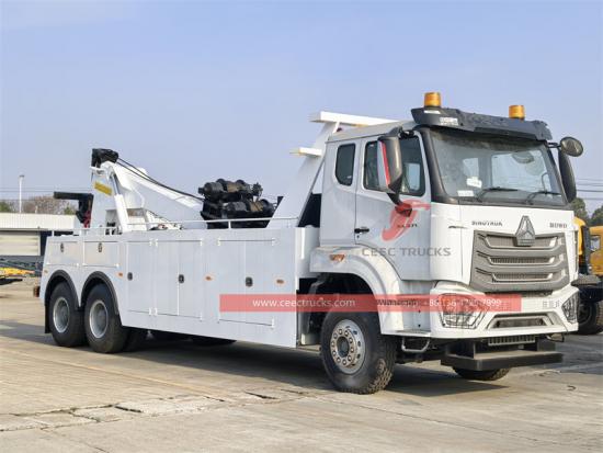 Questo pesante duty wrecker, built by CEEC Trucks Group, utilizes the Howo NX cabin 6 x 4 drive chassis and is equipped with a powerful Howo WP10.340E22 diesel engine (3 4 0 HP /1250N . m of torque) and an HW1 9710 10 -speed transmission. Combined with an HF9-ton front axle and HC16-ton rear axle, it ensures exceptional power, load-bearing capacity, and reliability. It incorporates two 1 2 ton s hydraulic winches, resulting in an impressive rated towing capacity of 30 tons, making it ideal for handling accidents involving large trucks, buses, and construction machinery.