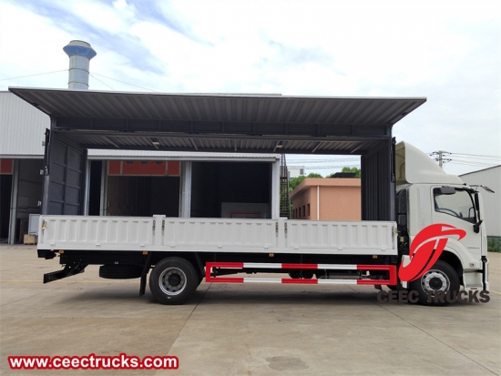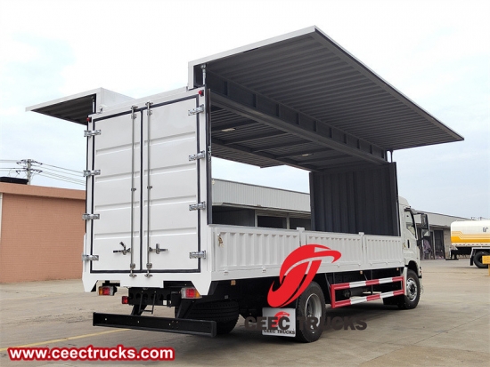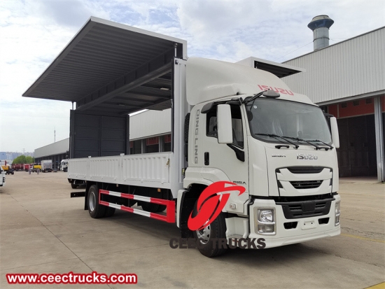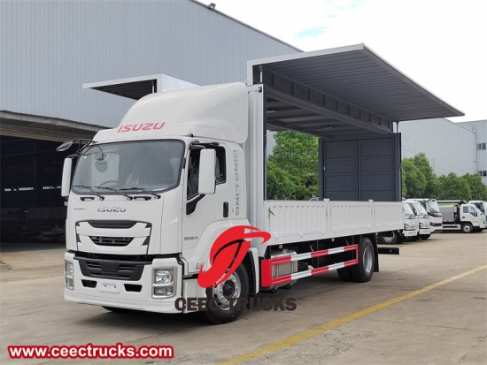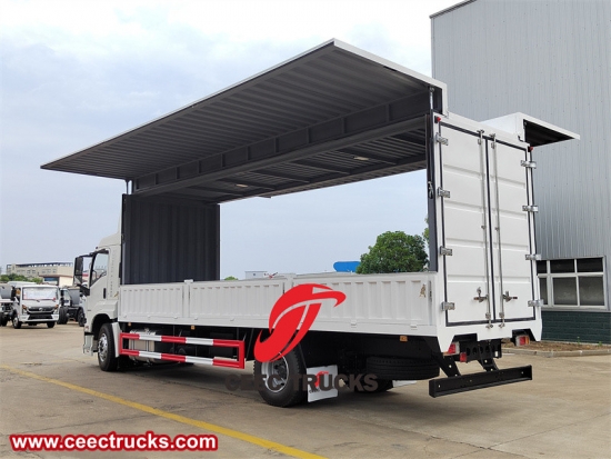 Isuzu Giga 4x2 205HP a 6 ruote Wing Van Truck, noto anche come furgone con apertura ad ali, è un miglioramento rispetto ai normali furgoni. Si tratta di un veicolo speciale in grado di aprire le ali su entrambi i lati della carrozzeria tramite molle di potenza, dispositivi manuali o dispositivi idraulici. La struttura superiore, del pannello anteriore e della porta posteriore dell'auto sono le stesse di quelle dei furgoni in lamiera ondulata e la parte laterale è composta da pannelli ribaltabili, pannelli laterali superiori e pannelli laterali inferiori.