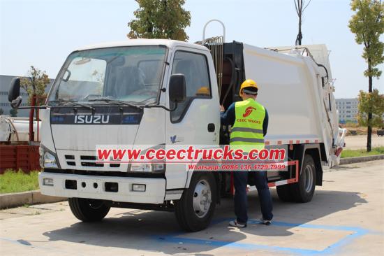 Rear tilting device for 240L and 1100L binsISUZU 6 Wheeler Municipal Posteriore Truccino della spazzatura può anche essere chiamato ISUZU NKR 6CBM REFITO CAMPIO COMPATTORE GARBAGE, Quale è un potente professionista Veicolo di smaltimento della spazzatura. Il camion compattatore del caricatore posteriore ISUZU da 6 cbm prodotto da camion CEEC è dotato di telaio ISUZU 4x2 ELF 600p, ISUZU 120 CHP 4KH1 Motore diesel, Sistema di manutenzione Euro 6 2999ml, Dies Assistancey, Dies Assistanceel, Dies Assistanceel, Dies Assistanceel, Diesant Dysants Il camion ha 3 modalità di funzionamento, incluso il controllo elettrico per can-bus nella cabina, il joystick idraulico, la scatola di controllo elettrica del bus-bus nel portellone