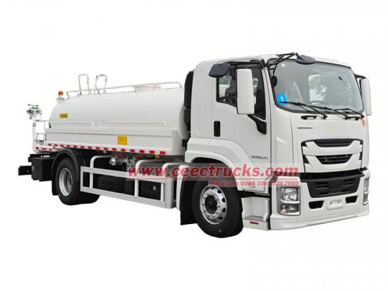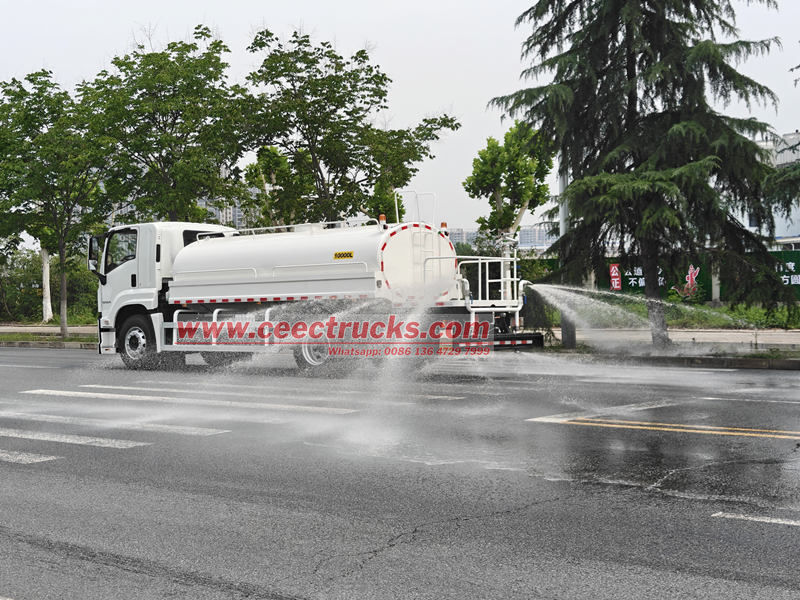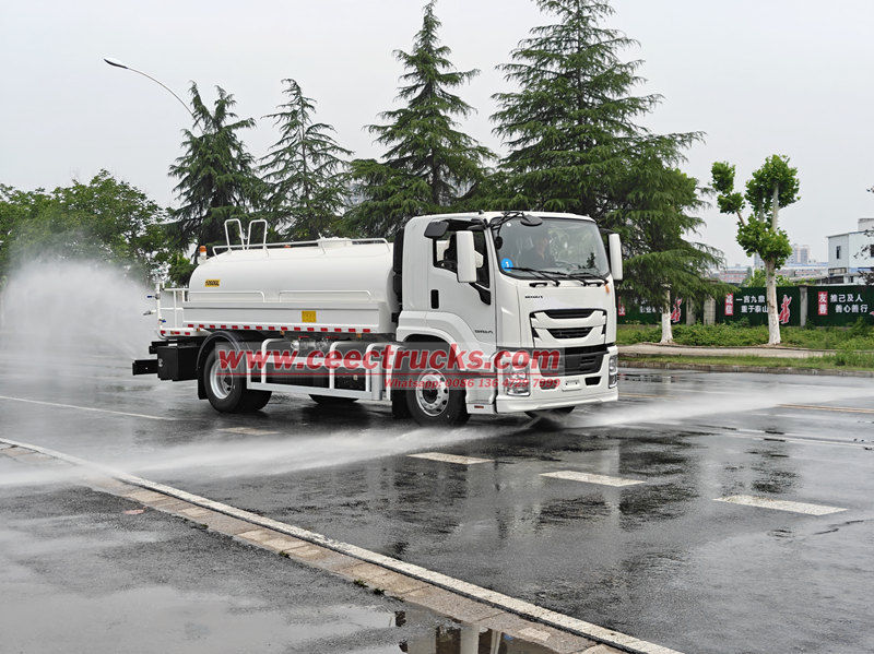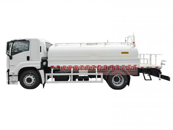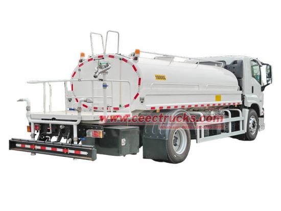 Autocisterna per acqua potabile Isuzu FTR modificata sul telaio Isuzu FTR GIGA, motore 4HK1-TC60, 4 cilindri in linea, potenza massima 151 kW (205 CV), cambio Isuzu MLD a 6 marce, la parte superiore è un serbatoio d'acqua in acciaio al carbonio da 10 mc, configurato con scarico anteriore, irrigatore posteriore e spruzzo laterale, una pompa dell'acqua speciale autoadescante in grado di pompare e drenare l'acqua, con un giunto antincendio, una valvola a gravità, una piattaforma di lavoro sul retro del serbatoio e un cannone per irrigazione verde installato. Il cannone può ruotare e regolare il volume d'acqua (spruzzo a colonna, nebulizzazione, pioggerella).