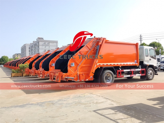 Camion compattatore di rifiuti ISUZU FVR 10cbm (chiamato anche rifiuti compattatore, camion di compressione rifiuti ISUZU, rifiuti di vendita diretta in fabbrica camion compattatore, camion per la raccolta rifiuti a carico posteriore ISUZU, camion con bidone a carico posteriore ISUZU, produttore di compattatori per rifiuti in Cina) è progettato per il trasporto quotidiano dei rifiuti in ambienti abitativi di ogni genere città, grandi stazioni, porti e banchine, aeroporti e zone densamente popolate aree come imprese industriali e minerarie e unità militari.
