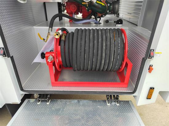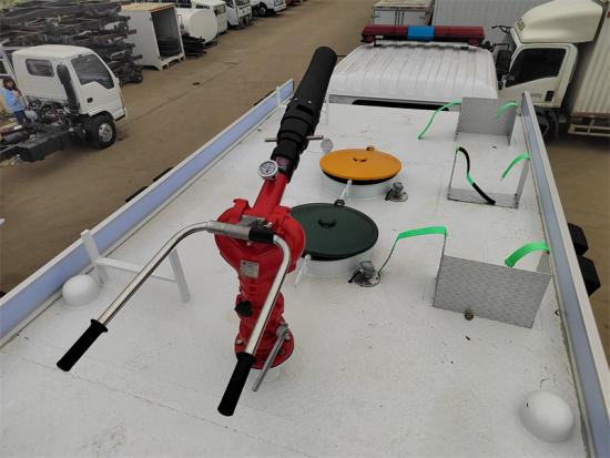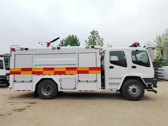 Autopompa antincendio ISUZU, nota anche come autopompa Isuzu, camion dei pompieri Isuzu, autopompa antincendio Isuzu. Costruita sul telaio del camion ISUZU FVR QL1180XMFRY, motore modello 6HK1-TCL da 300 CV, passo 4500, cabina singola originale con cuccetta da modificare in cabina doppia per l'equipaggio con 2 posti anteriori originali e 4 posti posteriori per autorespiratore, adatta al ricovero di apparecchiature respiratorie. La cabina doppia personalizzata ha superato il test di resistenza alla pioggia per oltre 2 ore. Presa di forza Sandich originale installata, collegata all'albero motore e alla pompa antincendio posteriore, modello XIONGZHEN CB10/40, con portata di 40 l/s a 10 bar, montata superiormente con monitor antincendio WESTER PL8/32, montato anche con naspo antincendio WESTER, con lunghezza di lavoro di 30 m e funzionamento manuale. La parte anteriore è un contenitore in lega di alluminio e la parte posteriore è decorata con una piastra in lega di alluminio, entrambe adatte allo stoccaggio e all'utilizzo di diversi tipi di attrezzature antincendio. La parte superiore della cabina dell'autocisterna antincendio Isuzu è dotata di un cuscino con luce LED, sirena e altoparlante.