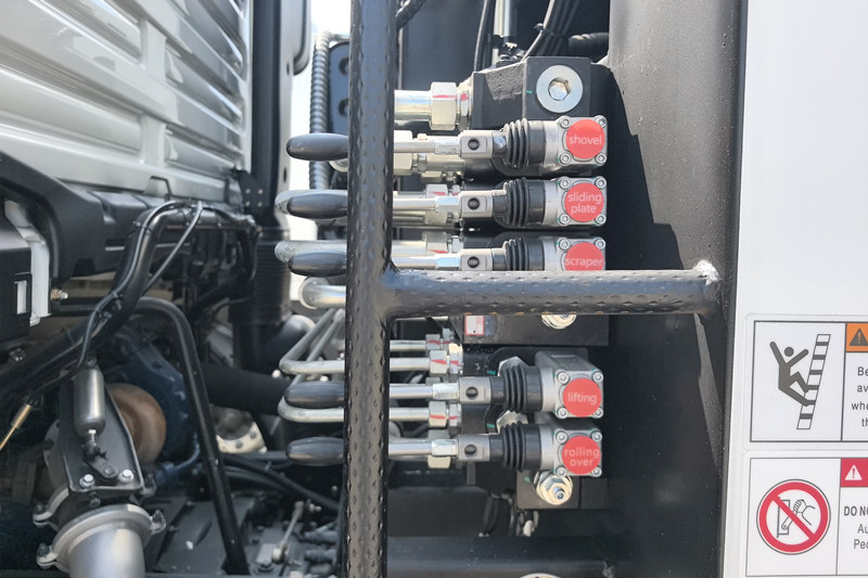 Il veicolo è dotato di pneumatici 12.00R20 (11 in totale), un serbatoio in lega di alluminio da 300 litri e caratteristiche come aria condizionata, porta USB, servosterzo e posti a sedere per tre passeggeri. La parte superiore è un bidone della spazzatura da 25 mc, quella posteriore è dotata di un meccanismo di ribaltamento del secchio e sono disponibili 3 metodi per azionare il camion per il carico e lo scarico.