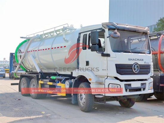 Shacman H3000 6×4 20000L esportazione di camion sottovuoto per liquami in Africa, motore diesel WEICHAI 340HP, cambio manuale a 12 turni Faust , cisterna in materiale di acciaio al carbonio ad alta resistenza, la capacità può variare da 16.000 a 25.000 litri. La famosa pompa per vuoto WEILONG della Cina e la pompa per vuoto importata JUROP / BP / MORO come opzione, il dispositivo di sollevamento idraulico per lo scarico dei rifiuti, la verniciatura e i loghi dipendono dalla richiesta.